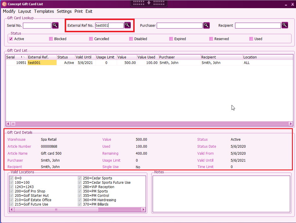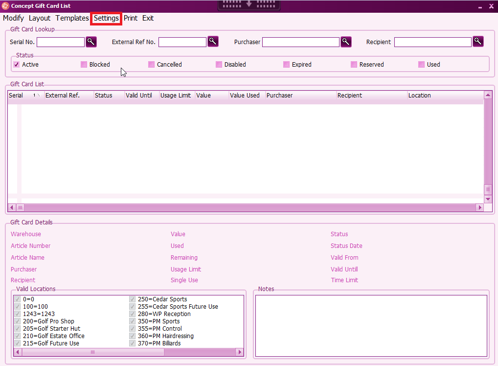 In the same screen there is also search options for Ext. Ref. , Serial No. purchaser and Recipient which can be used to locate a different Gift Card.