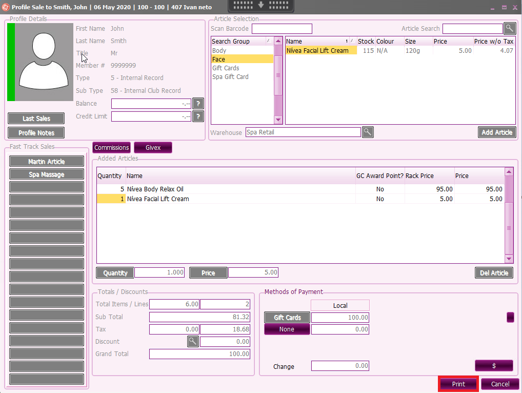2.3. On the sale screen, click Print to complete the sale.